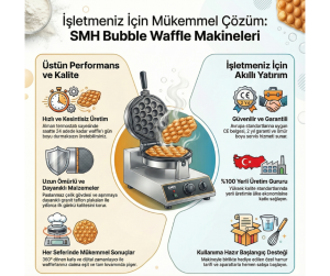 Kâr marjı yüksek, geri dönüş hızlı bir waffle işletmesi için SMH makine tercih etmeniz çok akıllıca bir karardır. Ürünlerimiz dayanıklı, enerji tasarruflu ve bakım masrafı düşük. Net karınız artar, işletmeniz daha verimli çalışır.